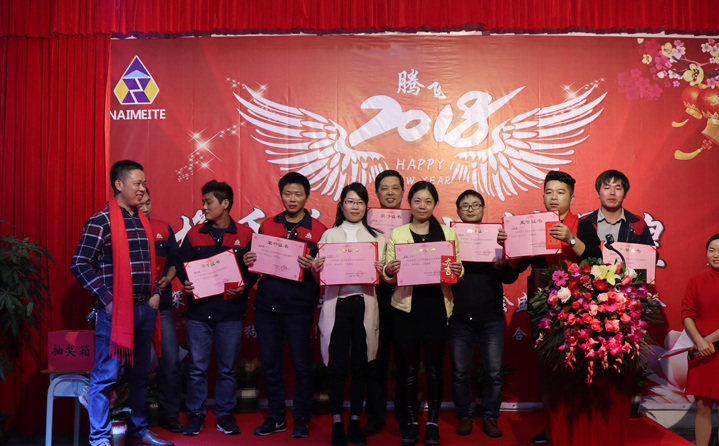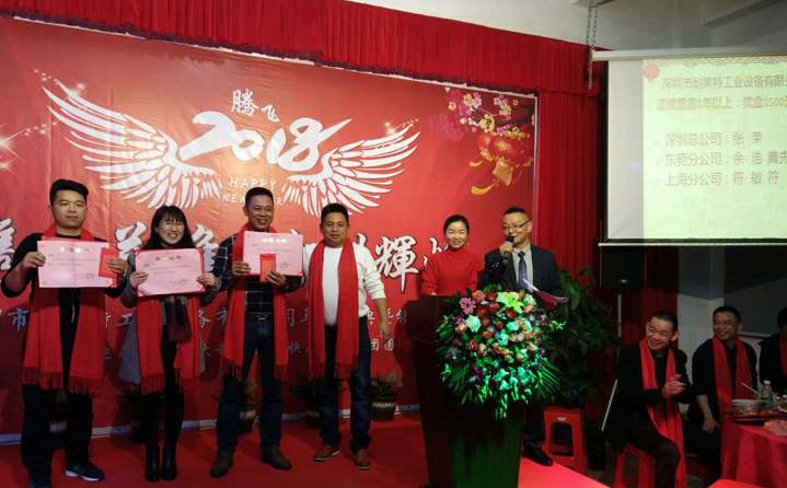席間耐美特集團公司高層領導人為2017年度優秀員工頒發了獎金及榮譽證書,以鼓勵大家在2018新的一年里再接再厲取得更好的業績。